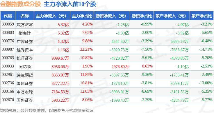 资金流向方面,金融指数(399240)成份股当日主力资金净流入合计21.77亿元,游资资金净流出合计6.15亿元,散户资金净流出合计15.63亿元。成份股资金流向详情见下表: