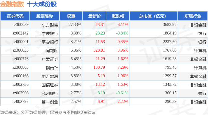 证券之星消息,12月5日,金融指数(399240)报收于1590.59点,涨2.22%,成交385.56亿元,换手率1.29%。当日该指数成份股中,上涨的有27家,瑞达期货以10.01%的涨幅领涨,下跌的有6家,青岛银行以2.06%的跌幅领跌。