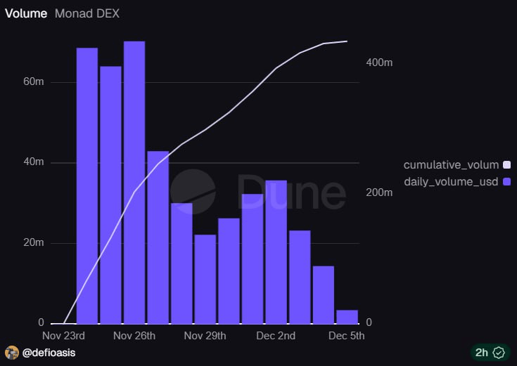 吴说获悉,据 @defioasis 数据面板,在上线一周多,Monad 链上已创建了接近 5 万种代币,其中在上线头两日创建了 2.1 万种代币;Monad DEX 每日交易量从主网上线头几日的 6,000 万美元下滑至不到 1,500 万美元,下滑超过 70%;Monad DEX 已有超过 22.5 万个交易地址,累积产生了 4.35 亿美元交易量。
