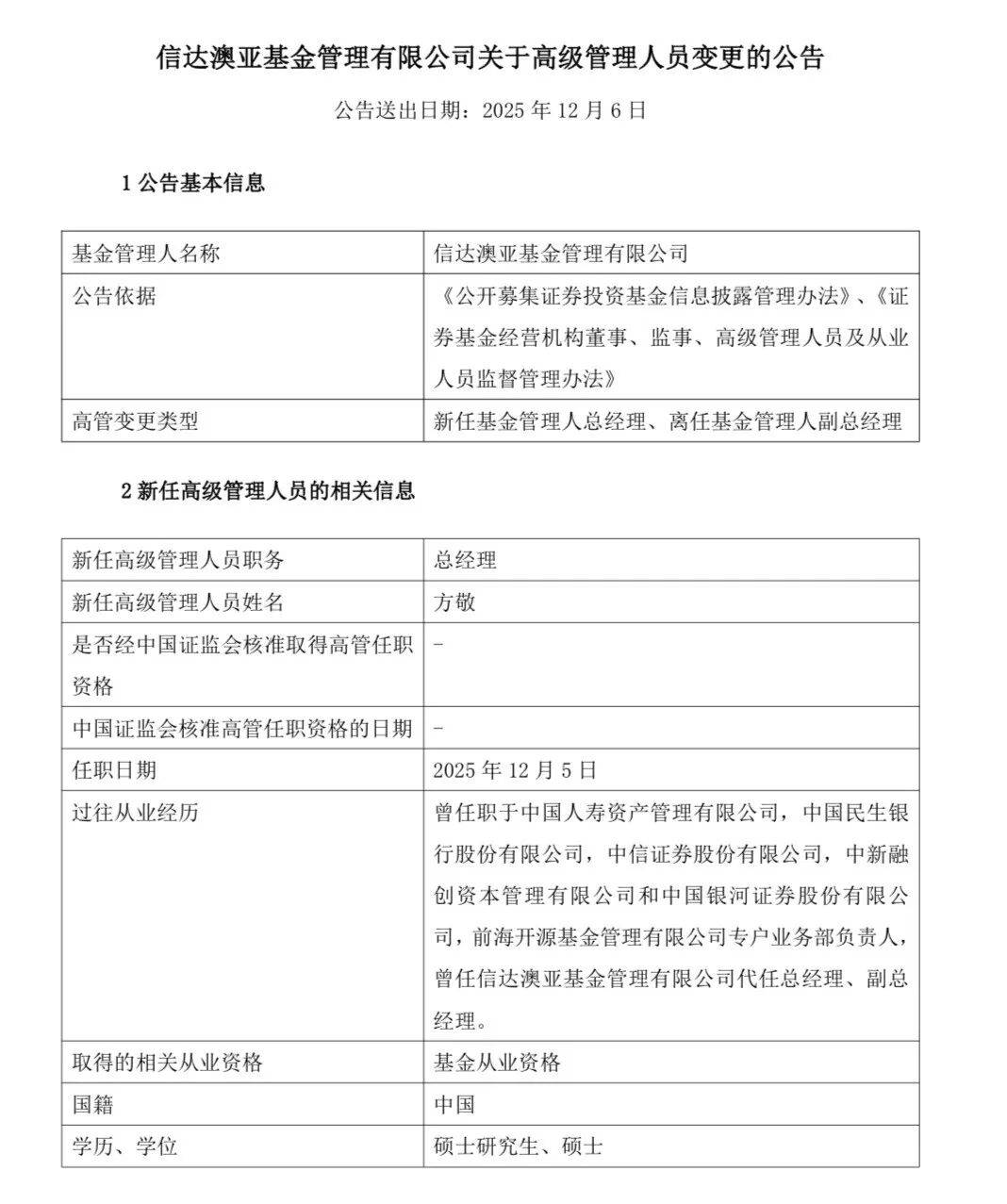12月5日晚间,信达澳亚基金公告称,方敬自12月5日起正式出任公司总经理一职,不再担任公司副总经理。此前,方敬于今年9月5日起代任信达澳亚基金总经理职务。