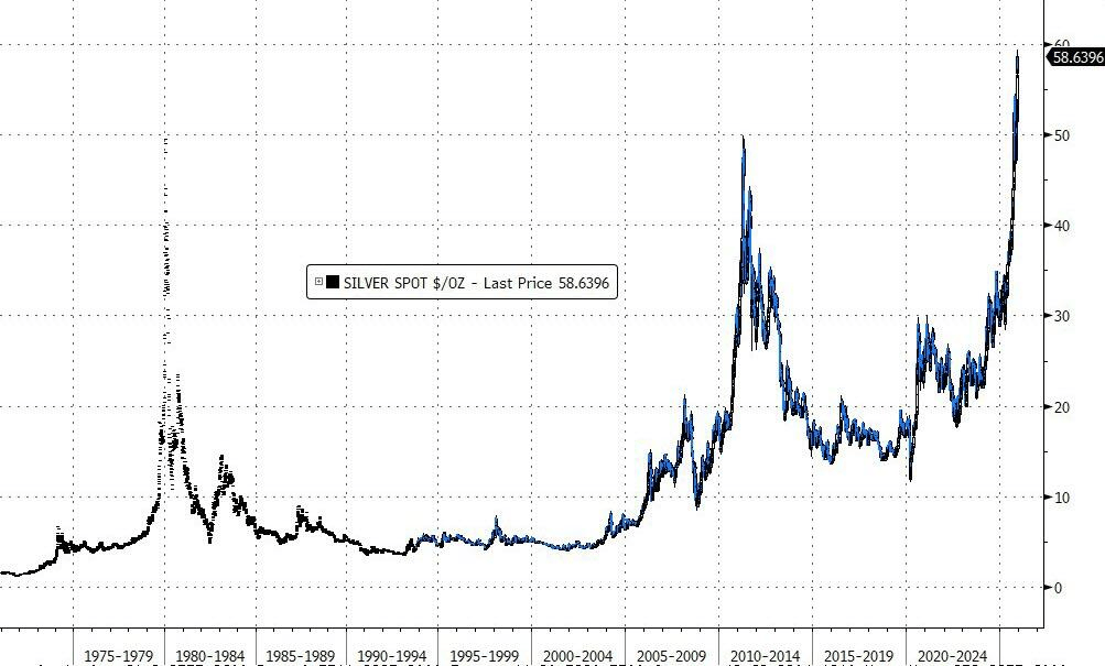 周五现货白银一度上涨3.9%,创下每盎司59.33美元的历史新高。