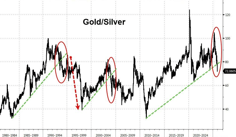 周五黄金走势则出现分化,日内冲高1%后转跌。这使得金银比价回落至2024年5月低点以下,约为72倍。