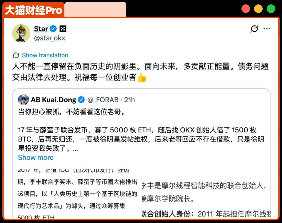 币圈大佬、OKX创始人徐明星转了一条“摩尔线程联合创始人李丰”相关的推文,并配文,“债务问题交由法律去处理”。