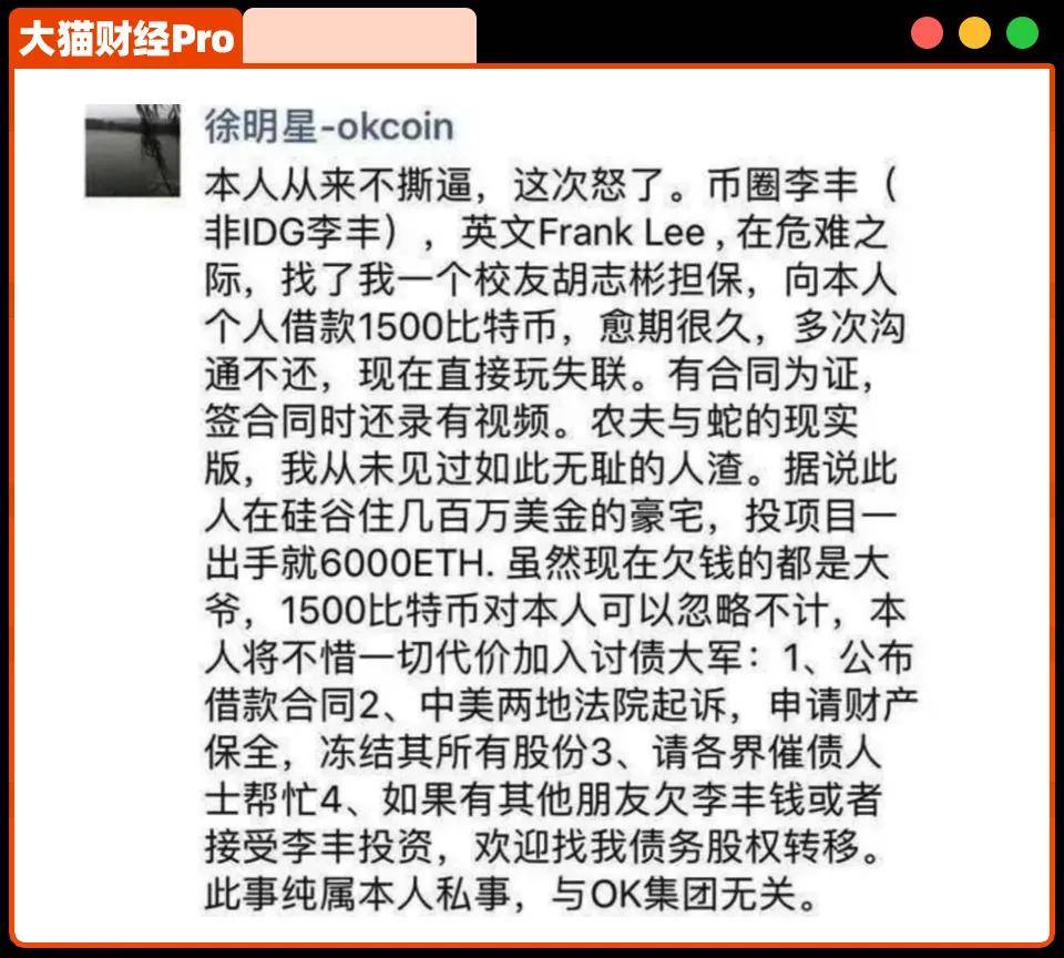 有媒体爆了李丰的回应,说这1500个比特币是徐明星投了他的MGD项目,项目没上线,结果徐明星反悔了,然后就撕破脸了。