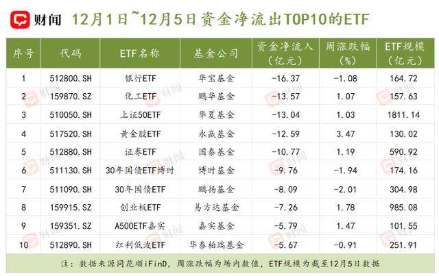 相比之下,风险相对集中的行业类ETF成为资金流出的重要区域,银行ETF(512800.SH)、化工ETF(159870.SZ)、黄金股ETF(517520.SH)以及证券ETF(512880.SH)单周净流出金额也均超过10亿元,侧面反映出投资者对部分高波动板块的阶段性避险情绪。