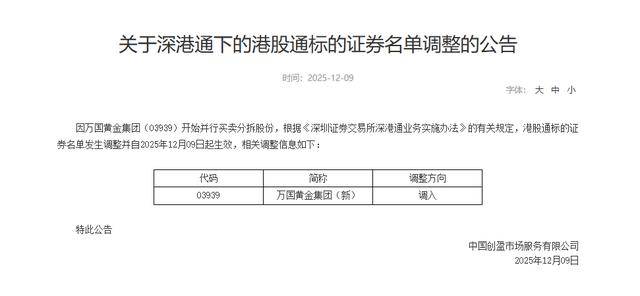 12月9日,深交所发布公告,因万国黄金集团(03939.HK)开始并行买卖分拆股份,根据《深圳证券交易所深港通业务实施办法》的有关规定,港股通标的证券名单发生调整并自2025年12月09日起生效。