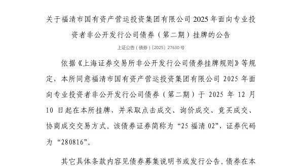 12月9日,上交所发布关于福清市国有资产营运投资集团有限公司2025年面向专业投资者非公开发行公司债券(第二期)挂牌的公告。