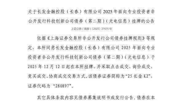 12月11日,上交所发布关于长发金融控股(长春)有限公司2025年面向专业投资者非公开发行科技创新公司债券(第二期)(光电信息)挂牌的公告。