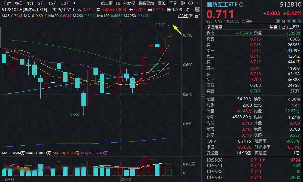 高人气国防军工ETF(512810)盘初一度涨超1%,价格再创近一个月新高!持仓商业航天概念股领涨,中国卫星涨超4%再创10年新高,湘电股份、光启技术、华秦科技等跟涨。