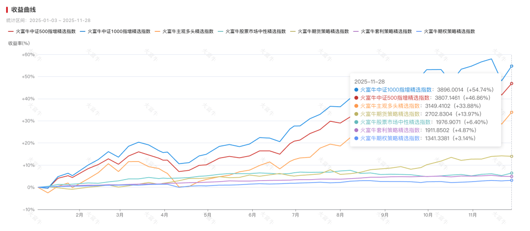 根据火富牛统计的私募策略数据,今年以来主观多头精选指数上涨33.88%,单独拉出来看其实还可以,但和量化一比又显得没有性价比: