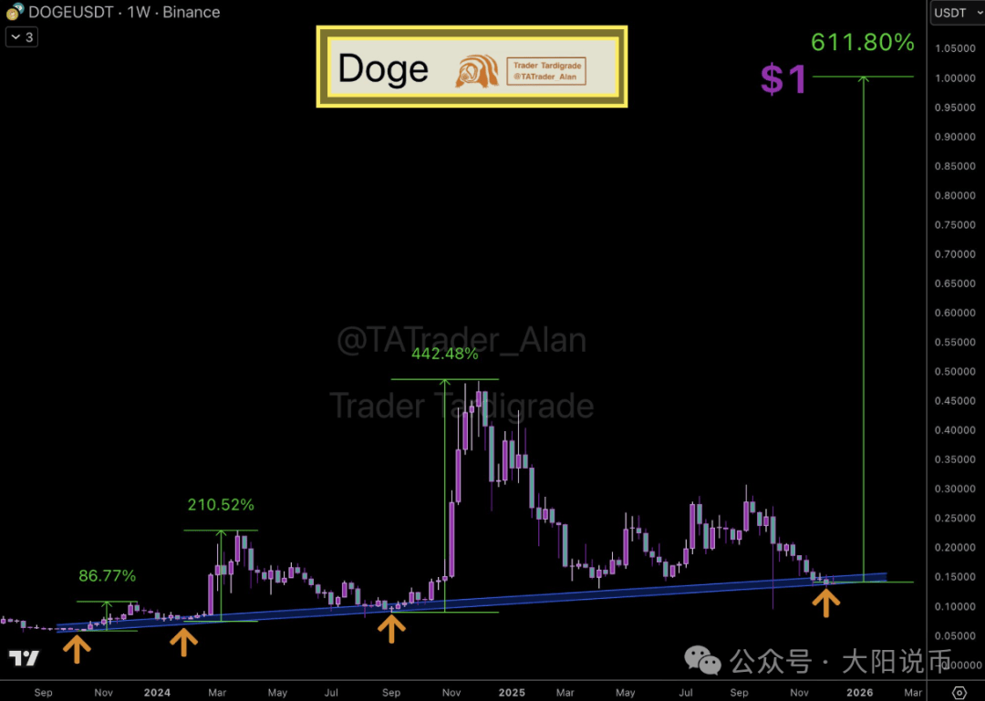 分析师Trader Tardigrade指出,DOGE目前正在测试一条自2022年延展而来的关键上升趋势线,该位置历史上多次成为后续大幅上涨的起点: