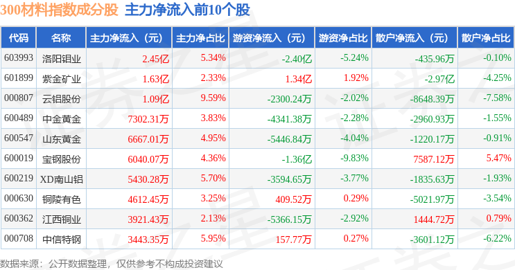 资金流向方面,300材料(000909)指数成份股当日主力资金净流出合计10.34亿元,游资资金净流入合计1.96亿元,散户资金净流入合计8.38亿元。成份股资金流向详情见下表: