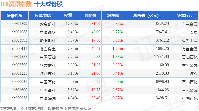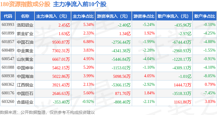 资金流向方面,180资源(000026)指数成份股当日主力资金净流出合计2.31亿元,游资资金净流出合计2.85亿元,散户资金净流入合计5.16亿元。成份股资金流向详情见下表: