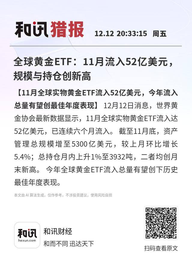 【11月全球实物黄金ETF流入52亿美元,今年流入总量有望创最佳年度表现】12月12日消息,世界黄金协会最新数据显示,11月全球实物黄金ETF流入达52亿美元,已连续六个月流入。截至11月底,资产管理总规模增至5300亿美元,较上月环比增长5.4%;总持仓月内上升1%至3932吨,二者均创月末新高。今年全球黄金ETF流入总量有望创下历史最佳年度表现。