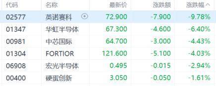 半导体股走弱,英诺赛科跌超9%,华虹半导体跌超6%,中芯国际、宏光半导体等跟跌。