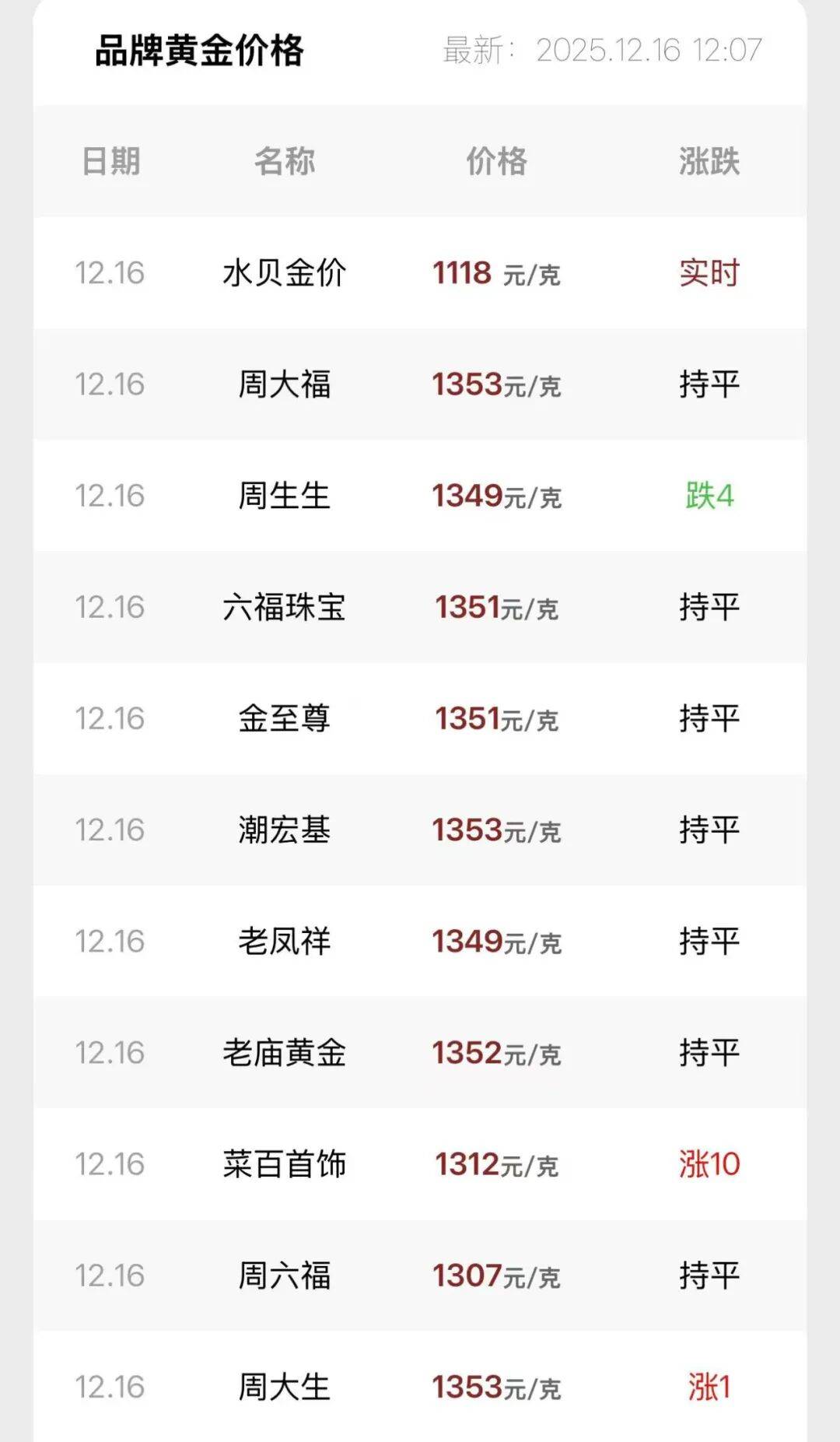 国内品牌金饰价格多日连涨态势也随之终结。12月16日,周生生足金饰品报1349元/克,较昨日的1353元/克跌4元/克,终结自12月10日起的五连涨;老庙黄金足金饰品报1352元/克,较昨日保持不变;老凤祥足金饰品报1349元/克,较昨日保持不变。