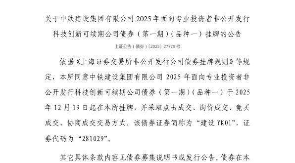 12月18日,上交所发布关于中铁建设集团有限公司2025年面向专业投资者非公开发行科技创新可续期公司债券(第一期)(品种一)挂牌的公告。