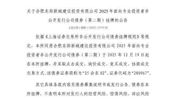 12月18日,上交所发布关于合肥东部新城建设投资有限公司2025年面向专业投资者非公开发行公司债券(第二期)挂牌的公告。