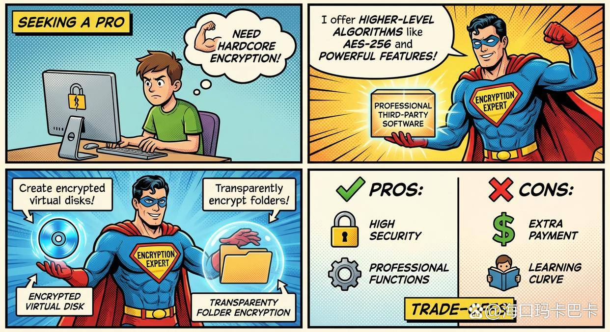 如果您觉得上述方法都不够“硬核”,那么可以考虑使用专业的第三方加密软件。这类软件通常提供更高级别的加密算法(如AES-256),功能也更强大,比如可以创建加密的虚拟磁盘、对文件夹进行透明加密等。