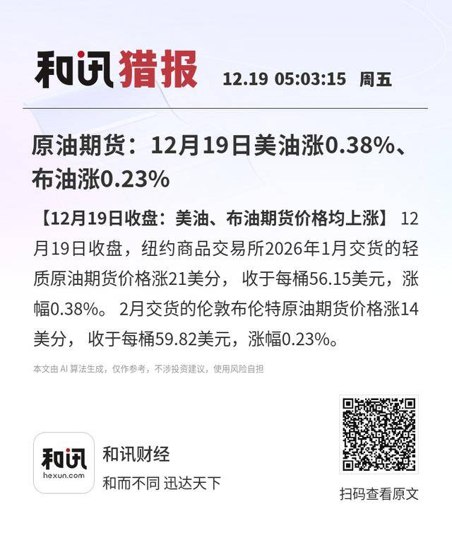 【12月19日收盘:美油、布油期货价格均上涨】12月19日收盘,纽约商品交易所2026年1月交货的轻质原油期货价格涨21美分,收于每桶56.15美元,涨幅0.38%。2月交货的伦敦布伦特原油期货价格涨14美分,收于每桶59.82美元,涨幅0.23%。