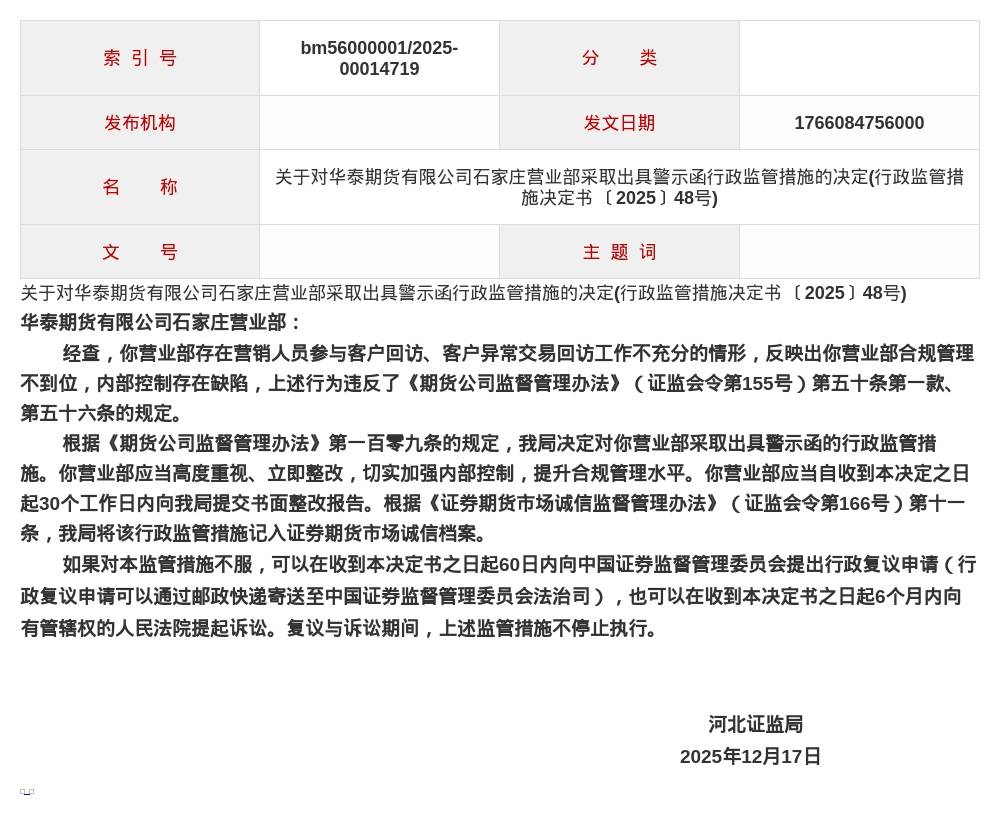 蓝鲸新闻12月19日讯,近日,河北证监局发布了一则行政监管措施决定书,剑指华泰期货有限公司石家庄营业部。