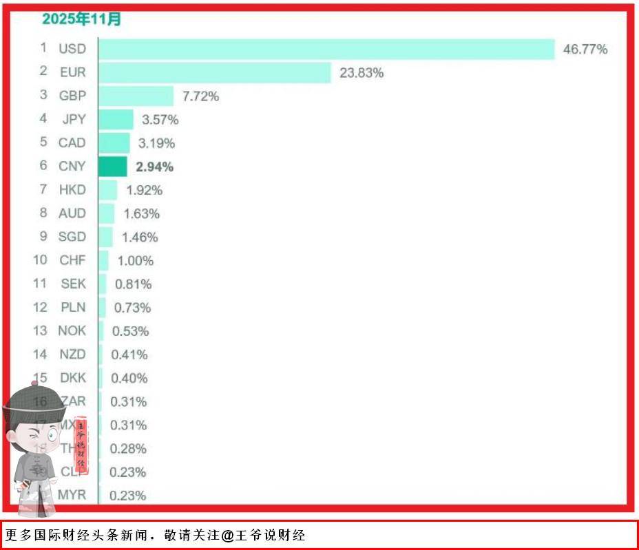 另外,数据还显示,11月,美元全球支付占比高达46.77%,欧元跌到23.83%。