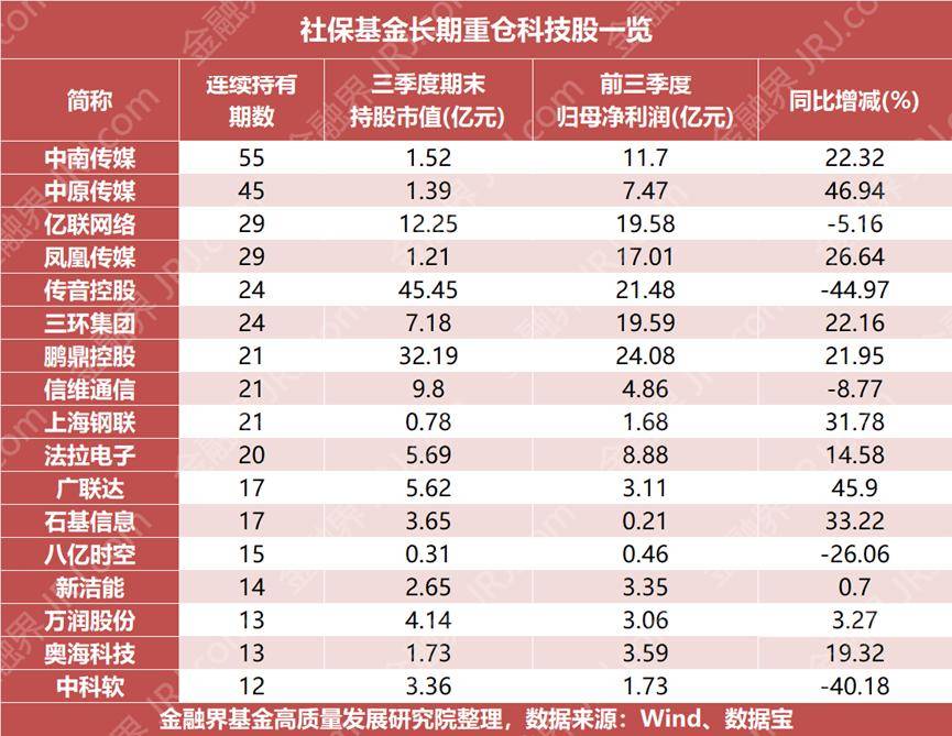 据数据宝统计,截至今年前三季度,有6只科技股票被社保基金连续重仓达24个季度(即6年)及以上。