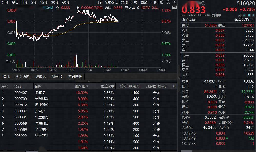 成份股方面,氟化工、锂电等板块部分个股涨幅居前。截至发稿,多氟多、天赐材料双双涨停,恩捷股份大涨超6%,新宙邦涨超5%,宏达股份、星源材质涨超2%。