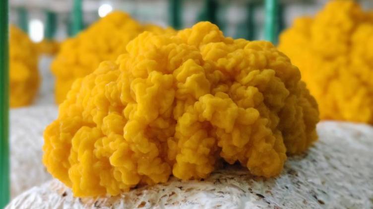 橙黄的金耳依偎在白色菌棒上舒展身姿。