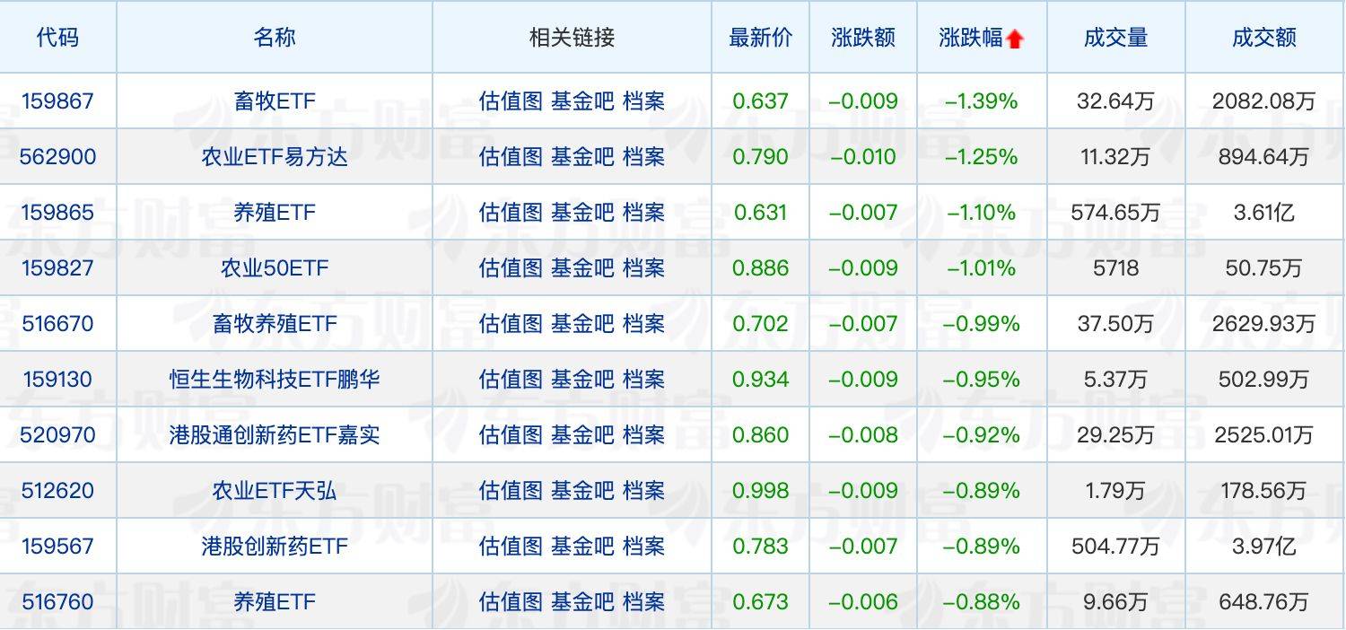 下跌方面,农业、养殖相关ETF回调,最大跌幅为1.39%。