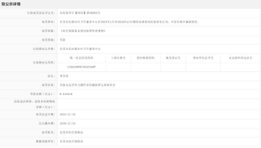 东坑镇社区卫生服务中心的违规时段为2023年1月至2024年12月,违规使用医保基金被罚款9.818479万元。