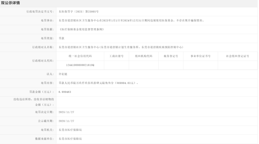 道滘镇社区卫生服务中心的违规时段与桥头镇一致,为2023年1月1日至2024年12月31日,同样因违规使用医保基金,不存在欺诈骗保情形,依据《医疗保障基金使用监督管理条例》被罚款6.999463万元。