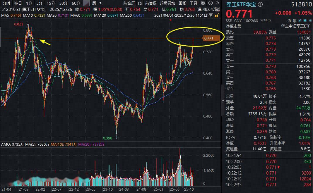 12月26日,商业航天有所分化,局部高温依旧!航天发展、电科网安、北斗星通集体涨停,铂力特涨超4%续创历史新高!高人气军工ETF华宝(512810)盘中涨超1%,场内最高价0.771元,一举突破9月1日创下的逾3年高点(0.767元),创下2022年1月6日以来新高!