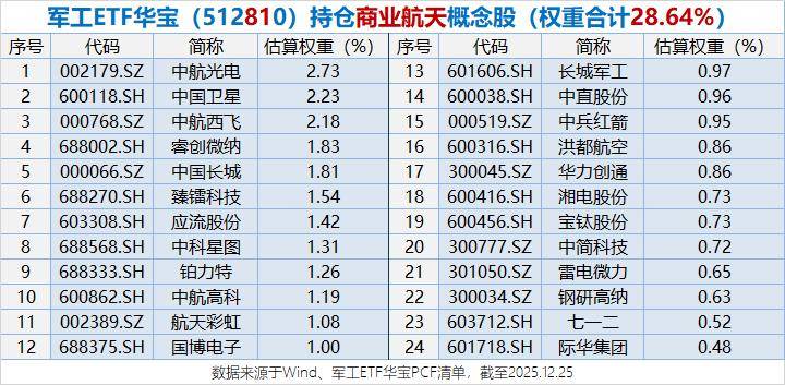风险提示:军工ETF华宝被动跟踪中证军工指数,该指数基日为2004.12.31,发布于2013.12.26。文中提及个股仅为指数成份股客观展示列举,不作为任何个股推荐,不代表基金管理人和基金投资方向。任何在本文出现的信息(包括但不限于个股、评论、预测、图表、指标、理论、任何形式的表述等)均只作为参考,投资人须对任何自主决定的投资行为负责。另,本文中的任何观点、分析及预测不构成对阅读者任何形式的投资建议,本公司亦不对因使用本文内容所引发的直接或间接损失负任何责任。投资人应当认真阅读《基金合同》、《招募说明书》、《基金产品资料概要》等基金法律文件,了解基金的风险收益特征,选择与自身风险承受能力相适应的产品。基金的过往业绩并不预示其未来表现,基金管理人管理的其他基金的业绩并不构成基金业绩表现的保证。根据基金管理人的评估,基金的风险等级均为R3-中风险,适宜平衡型(C3)及以上的投资者,适当性匹配意见请以销售机构为准。销售机构(包括基金管理人直销机构和其他销售机构)根据相关法律法规对以上基金进行风险评价,投资者应及时关注基金管理人出具的适当性意见,各销售机构关于适当性的意见不必然一致,且基金销售机构所出具的基金产品风险等级评价结果不得低于基金管理人作出的风险等级评价结果。基金合同中关于基金风险收益特征与基金风险等级因考虑因素不同而存在差异。投资者应了解基金的风险收益情况,结合自身投资目的、期限、投资经验及风险承受能力谨慎选择基金产品并自行承担风险。中国证监会对以上基金的注册,并不表明其对以上基金的投资价值、市场前景和收益做出实质性判断或保证。基金投资须谨慎。