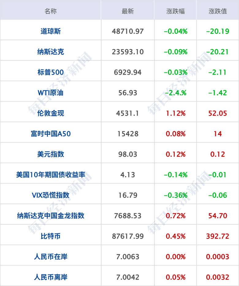 美股三大指数收盘均微跌,纳指跌0.09%,道指跌0.04%,标普500指数跌0.03%,大型科技股涨跌不一,特斯拉跌超2%,谷歌、苹果、微软、Meta等小幅下跌;英伟达涨超1%,亚马逊、奈飞、英特尔小幅上涨。纳斯达克中国金龙指数涨0.72%,中概股多数上涨,小鹏汽车涨超6%,蔚来涨近4%,阿里巴巴、百度涨超1%;霸王茶姬跌2.54%。