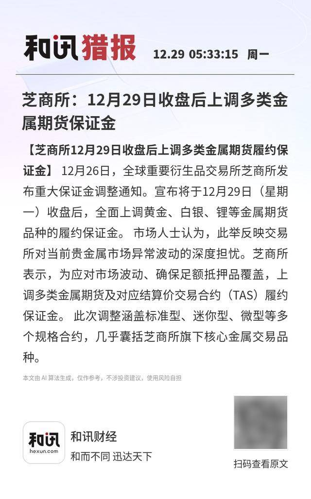 【芝商所12月29日收盘后上调多类金属期货履约保证金】12月26日,全球重要衍生品交易所芝商所发布重大保证金调整通知。宣布将于12月29日(星期一)收盘后,全面上调黄金、白银、锂等金属期货品种的履约保证金。市场人士认为,此举反映交易所对当前贵金属市场异常波动的深度担忧。芝商所表示,为应对市场波动、确保足额抵押品覆盖,上调多类金属期货及对应结算价交易合约(TAS)履约保证金。此次调整涵盖标准型、迷你型、微型等多个规格合约,几乎囊括芝商所旗下核心金属交易品种。