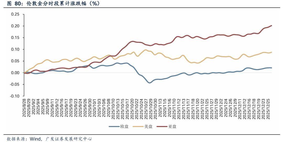 我们发现,在上一轮行情中欧洲投资者明显缺席。主要原因在于今年欧洲投资者的配置思路是:年初美国例外论破灭+欧洲复兴叙事,使得欧洲资金回流欧股和欧债;而后美国基本面维持韧性叠加欧洲内部矛盾未平,资金再度回流美元资产。从伦敦金分时段的表现来看,11月以来欧洲投资者有明显入场迹象,未来增量可期。