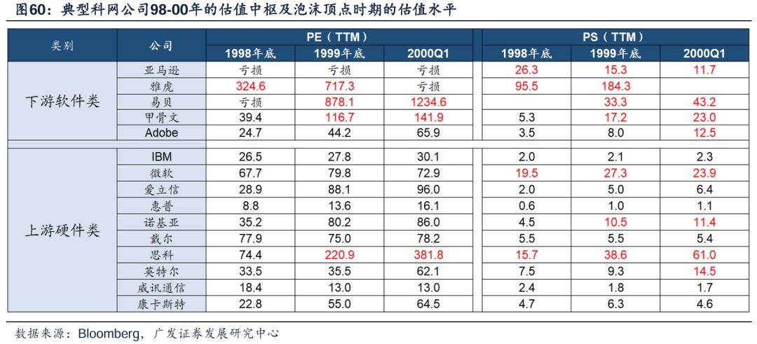 英特尔在99年以前的PE波动区间是8倍到20倍,而99年下半年以后开始突破20倍PE,最高点达到55倍;微软在99年以前的PE波动区间是17倍到30倍,而99年下半年以后也开始突破中枢,最高点超过80倍;思科估值高点突破200倍。