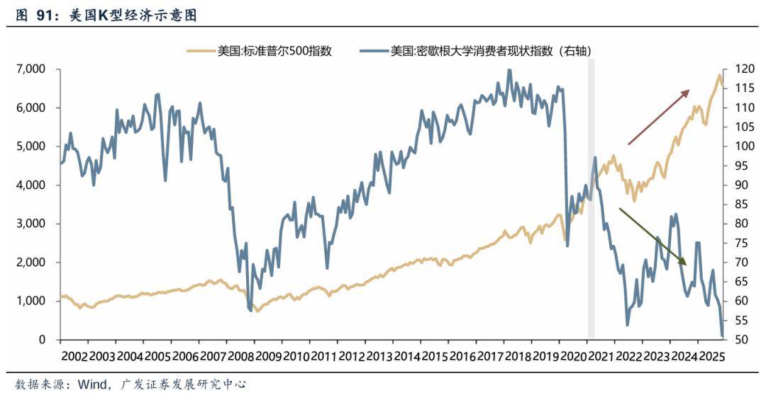 但是经济整体回暖的背景下,美国经济的结构却存在隐患。由于股票资产集中于最富有的群体中,近几年股市的上涨持续推高了他们的财富,美国贫富差距有扩大的趋势,经济结构呈现K型模式。