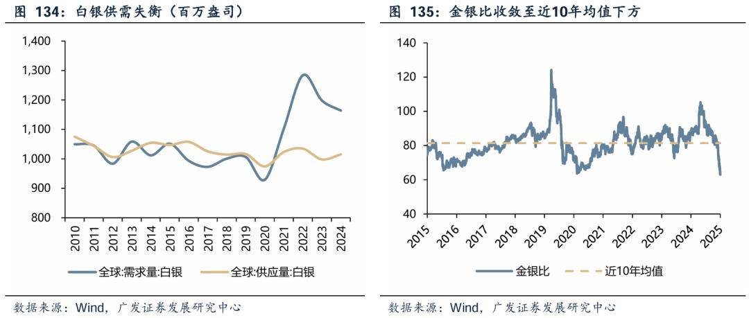 白银与黄金在金融和避险属性上具有相似性,同样受通胀和真实利率下降的支撑,但主要区别是白银的工业属性。白银在未来十年有望在绿色能源转型和数字化转型的关键行业中扮演"下一代金属"的关键角色。在光伏、汽车和电动汽车以及数据中心和人工智能行业中的需求逐渐提升。可以认为白银既有世界改变不了的属性,也具有改变世界的属性。因此,持续看好金银比收敛机会。