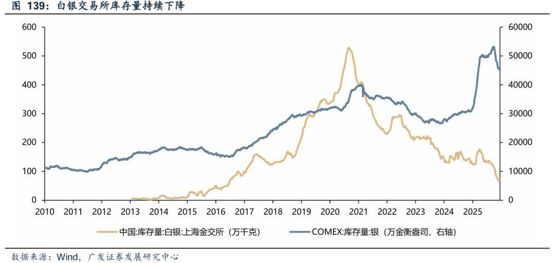 除基本面外,白银逼仓是银价不断冲高的重要因素。逼仓本质是多头借现货短缺与期货交割规则刚性,挤压空头,最终致价格脱离基本面剧烈波动。伦敦陷入白银紧缺之后,上海的白银库存也在不断下降到十年低点,美国10月初以来纽约Comex期货交易所金库中已有约7500万盎司白银被提走。全球库存告急导致全球白银市场经历罕见的流动性危机,库存见底与工业需求激增触发多轮逼仓行情。