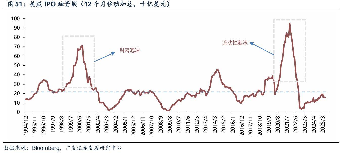 相比之下,当前美国IPO市场的规模仍处于低位。截至2025年6月,过去 12 个月的累计 IPO 总额仅为160亿美元,距离过去20年的均值仍有相当一段距离,这足以反映当前市场情绪有所回暖,但远没到泡沫的情况。