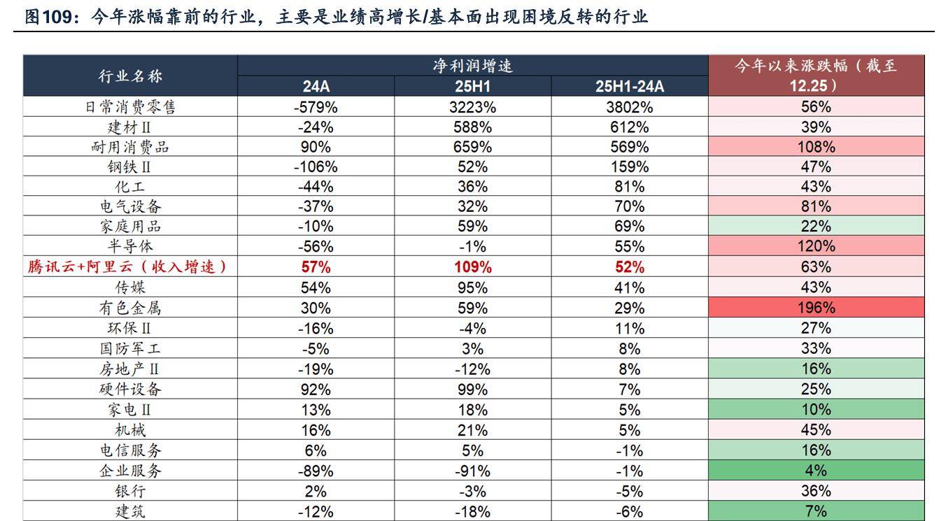一方面,传统行业和新兴产业出现业绩分化,新兴产业迎来快速增长,而港股整体业绩增速主要受到传统行业拖累。另一方面,有业绩支撑的行业涨幅更大,支撑指数整体上涨,例如新能源、AI、有色金属、钢铁、半导体等,而业绩增速继续回落的行业,涨幅普遍较小,例如地产、基建、消费、金融等。