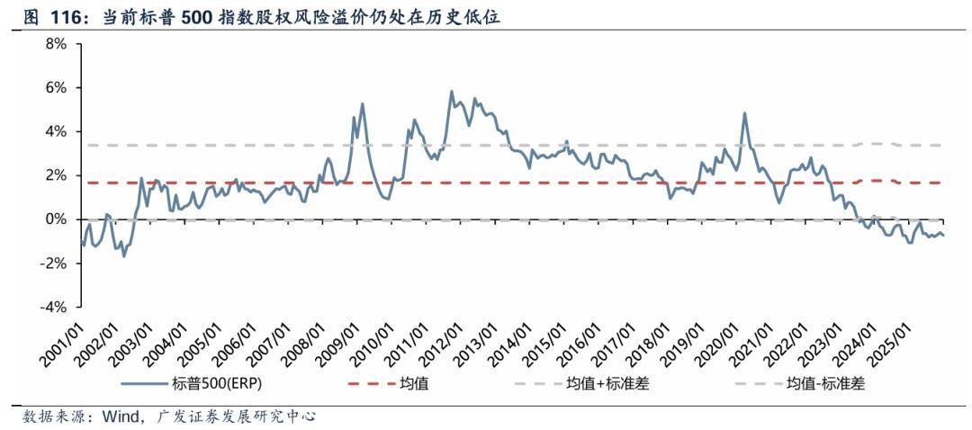 展望后市,当前美股估值高于合理水平,需要持续依靠消费支持经济,叠加货币宽松实现“软着陆”预期,能否“软着陆”是美股估值能否得到消化的关键。根据标普500指数股权风险溢价与一致预期市盈率的数据,当前美股整体估值依旧处在历史高位。虽然四季度以来,美股在AI融资担忧、流动性收紧等问题之下,陷入震荡走势,但指数调整幅度有限,估值压力也并未得到释放。当前,标普500指数的股权风险溢价已再度接近2000年以来的最低水平。