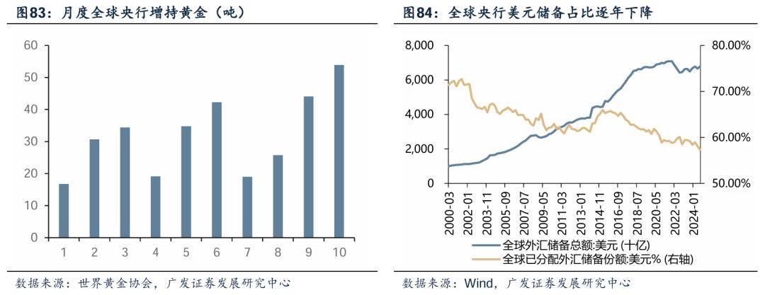 在此背景下,央行增持黄金的力度将持续增加。特朗普关税、美联储独立性减弱、美国债务问题加重均加速美元信用恶化,黄金作为非主权货币配置价值凸显。对比央行储备中美元资产撤出,增持黄金趋势还将延续。我国黄金储备为2832.9吨,仅占总储备资产的7%左右,新兴国家面临的国际环境风险更大,黄金储备占比却更低,具有较大的增持空间。