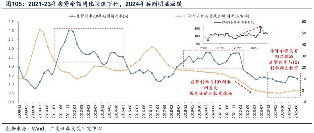 其二,居民资产负债表的影响在逐步降低:①从偿还债务的情况看,2021-2023年能看到早偿率的上升、房贷余额同比快速下行,2024年后则明显放缓;②居民资产负债表恶化对投资意愿带来的冲击,已经在2024Q3见底,当前处在风偏修复阶段。