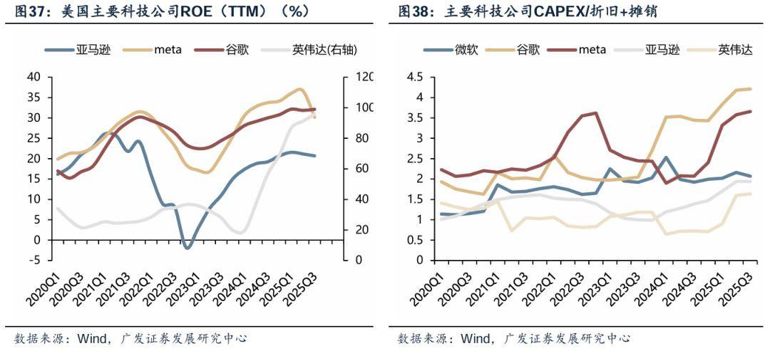 即便投资加速膨胀,但科技类公司并不是“虚胖”。几大主要科技公司的资本开支/折旧与摊销的比值快速上攀,谷歌的比率甚至在2025Q3超越4.0,除了可以理解为资本开支本身增速极大以外,还可以理解为重资产投资加速。相比于互联网营销等轻资产,能够落地的重资产投资更能产生规模效应。