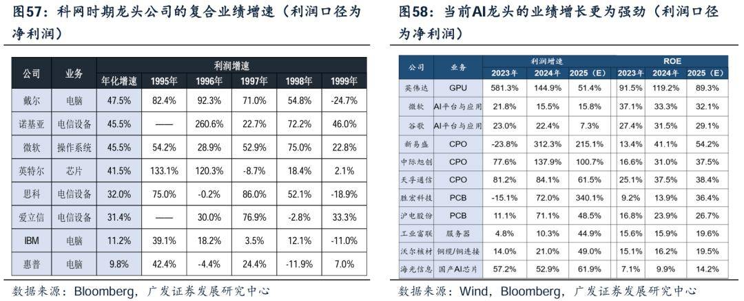 对标科网,本轮AI“卖铲人”业绩增长更为强劲,但与科网当时5年以上的复合高速增长相比,本轮的持续性暂且未知。当前AI产业A股与美股的核心标的,业绩已有呈现,ROE亦处高位(不乏30%以上),但能否有持续的业绩兑现还需看到供给端的瓶颈突破、以及应用端及新的商业模式涌现带来的增量需求。