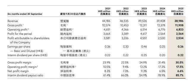 11月25日,周大福发布截至2025年9月30日止六个月中期业绩公告,公司实现营收约389.86亿港元,同比下降1.1%;股东应占溢利约25.34亿港元,同比增长0.1%。