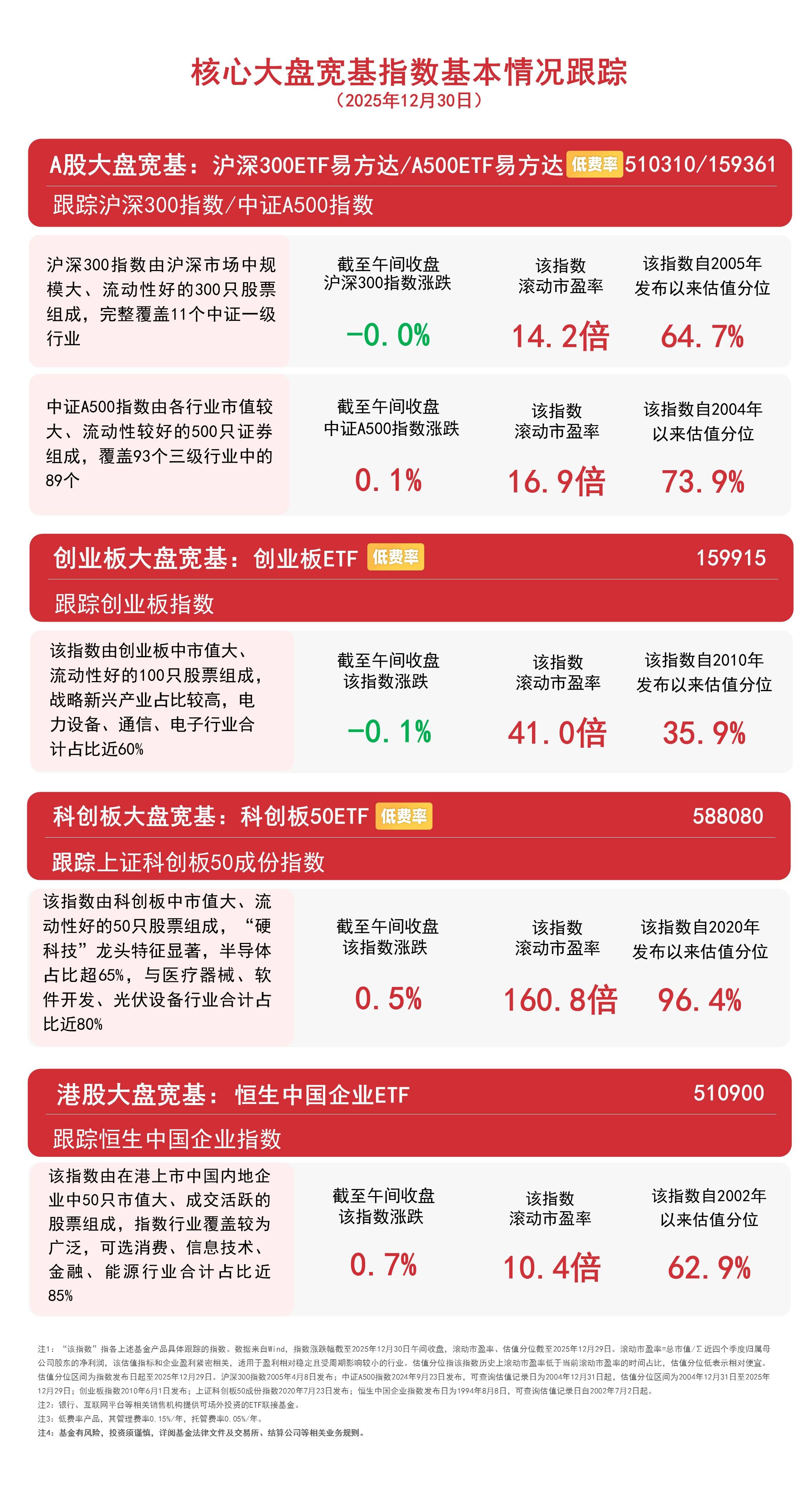 今日早盘,A股三大指数涨跌不一,沪指低位震荡跌0.1%。板块题材上,稳定币、冰雪旅游、加密货币等概念活跃,海南、光伏玻璃、保险板块调整;港股震荡分化,石油石化、半导体、有色金属板块涨幅居前,医药板块回调。截至午间收盘,中证A500指数上涨0.1%,创业板指数下跌0.1%,上证科创板50成份指数上涨0.5%,恒生中国企业指数上涨0.7%。